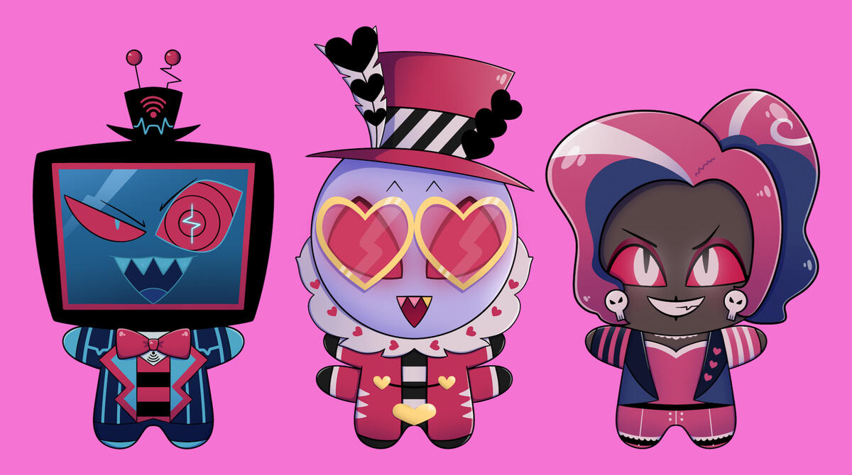 | vox, val, velvette, alastor, lucifer, sir pentious, baxter, nifty | stolas, blitzø, fizzarolli, verosika, octavia |